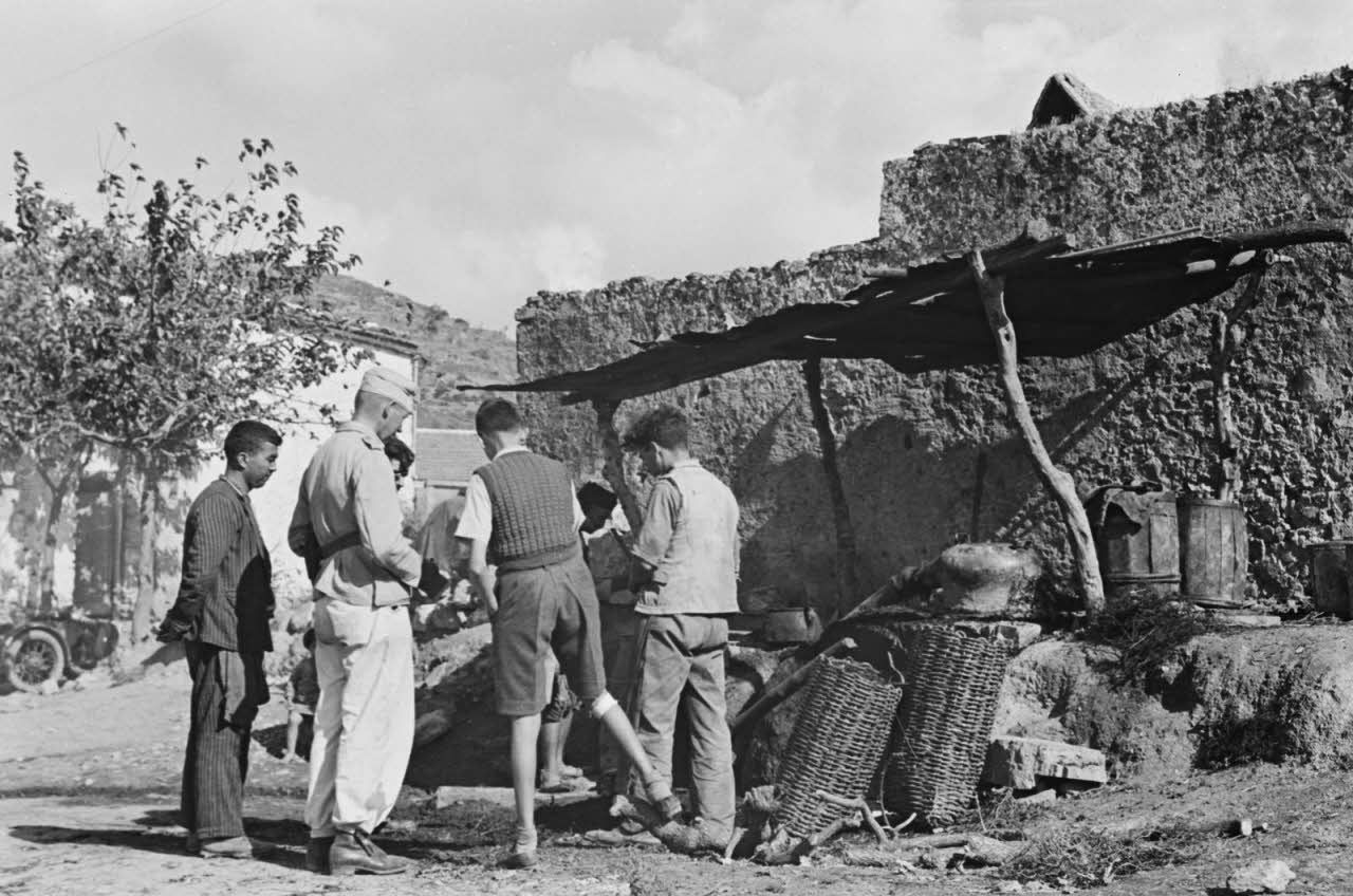 Xidas, ici aussi des soldats de la Luftwaffe sont hébergés en raison du terrain d'aviation tout proche. L'église et les oliviers du village. Fabrication (distillation) d'alcool. Un soldat de la Luftwaffe goûte le Schnaps. Des crétoises filent de la laine de mouton.