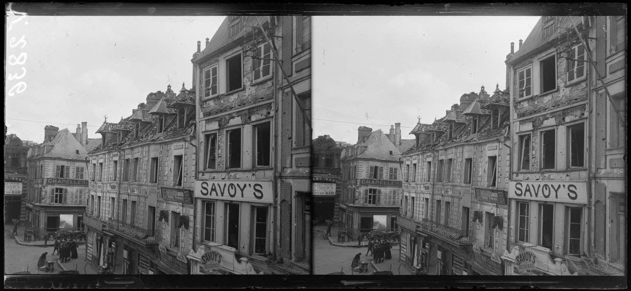 - Dans la ville d'Amiens (Somme, 22/06/1918, V 2848 à V 2854), place Gambetta, l'hôtel du Périgord est détruit à l'instar de nombreuses habitations situées rues Lourendeau, Cozette, Latour, rue des Jacobins. Les archives de la mairie sont évacuées par crainte d'être détruite lors d'un bombardement (V 2864 à V 2867).