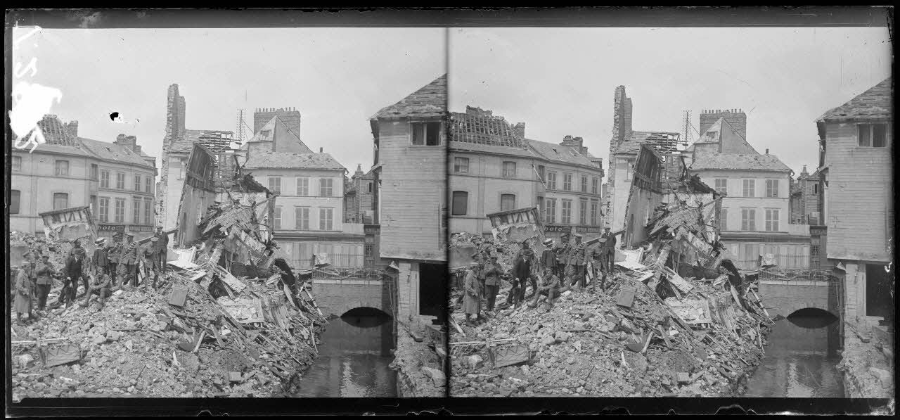 - A Abbeville (Somme, 20/06/1918, V 2833 à V 2847) les maisons autour de la place Courbet et de la place Sainte-Catherine sont dévastées par les bombardements. Le monument de l'amiral a été endommagé. Rue Saint-Jean des Prés, une colonne d'artillerie britannique remonte la rue.