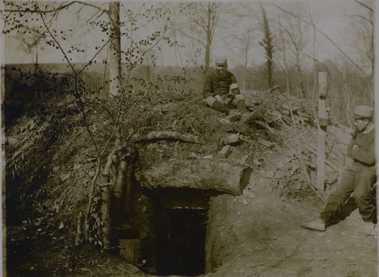 Les archives photographiques du médecin major Augarde (1869-1943), affecté au 138e régiment d''infanterie, sont caractéristiques de la production d''images fixes militaires pendant la Grande Guerre : portraits de militaires, pièces d''artillerie et mitrailleuses avec leurs servants, villages en ruine suite aux bombardements ennemis, abris de fortune aménagés dans des tranchées, etc. Les photographies cotées en D0349-005 étaient conditionnées dans une enveloppe intitulée « Divers ».