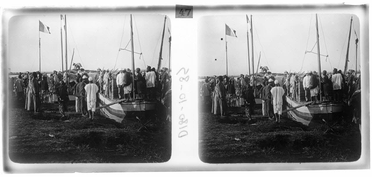 [Accostage d'un chaland sur une rive du fleuve Niger].