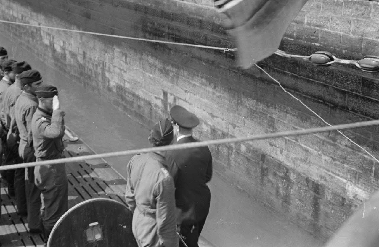Dans le port de Saint-Nazaire, l'accueil réservé au commandant du sous-marin U-203, le Kapitänleutnant Rolf Mützelburg.