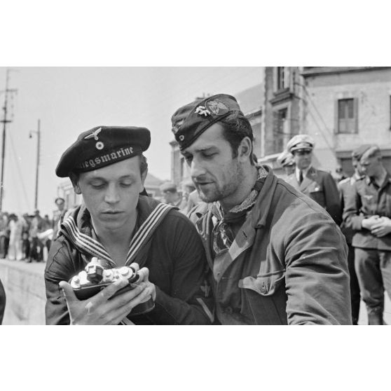 Dans le port de Saint-Nazaire, lors de l'arrivée du sous-marin U-203, un sous-marinier et un reporter équipé d'un Leica III.