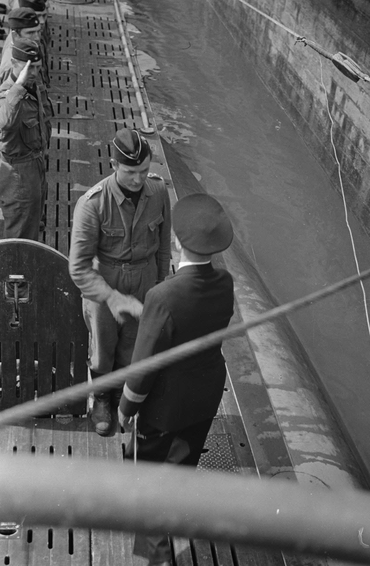 Dans le port de Saint-Nazaire, l'accueil réservé au commandant du sous-marin U-203, le Kapitänleutnant Rolf Mützelburg.