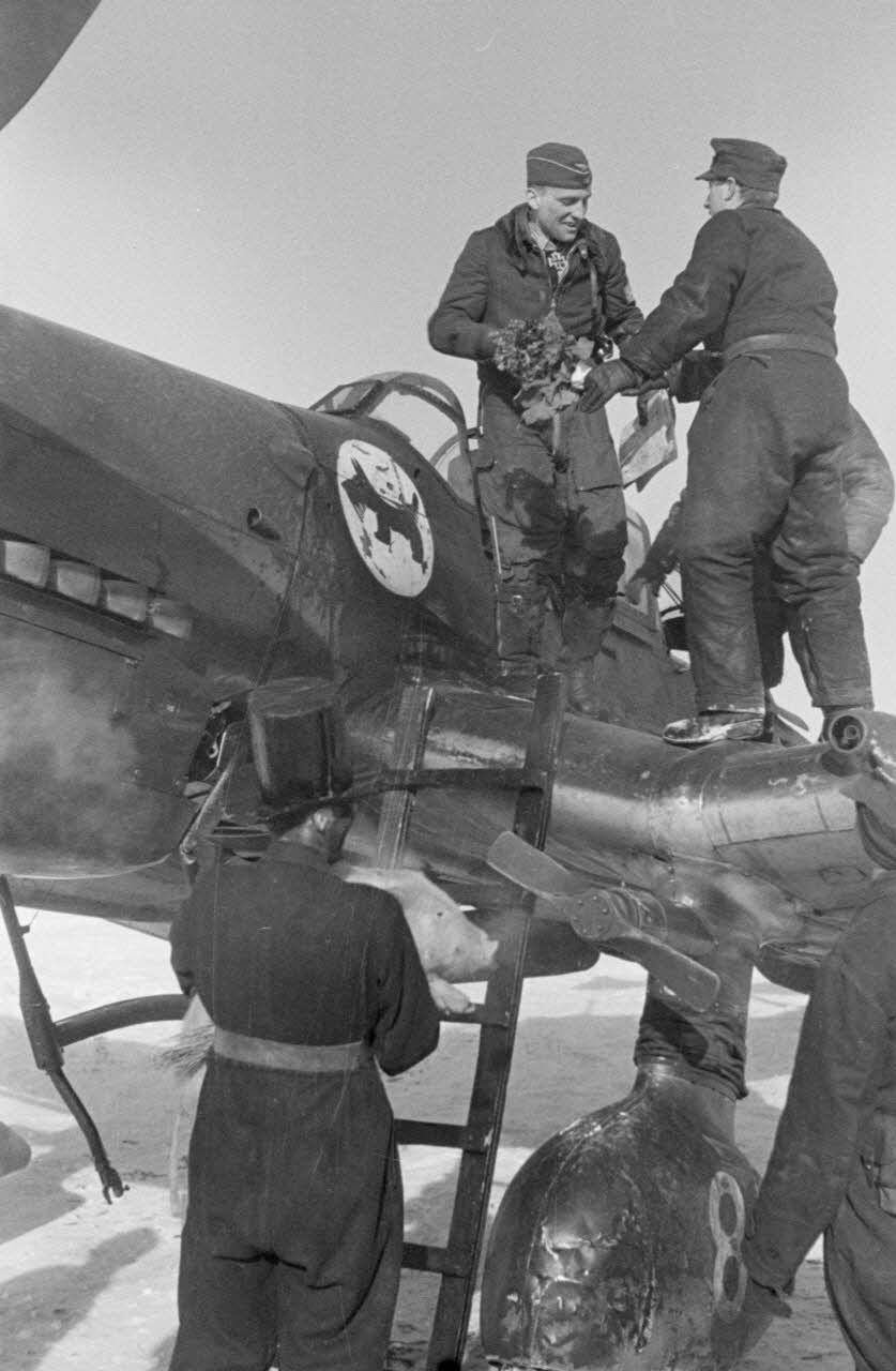 On reconnaît l'insigne du 1./StG.2 sur le nez de l'avion (DAA 2704 L14 et L15). A la descente de l'avion, l'équipage est porté par les pilotes et les mécaniciens du groupe de bombardement. Hans-Ulrich Rudel et Erwin Hentschel posent pour le reporter avec un cochon (porc) dans les bras, un signe de chance.