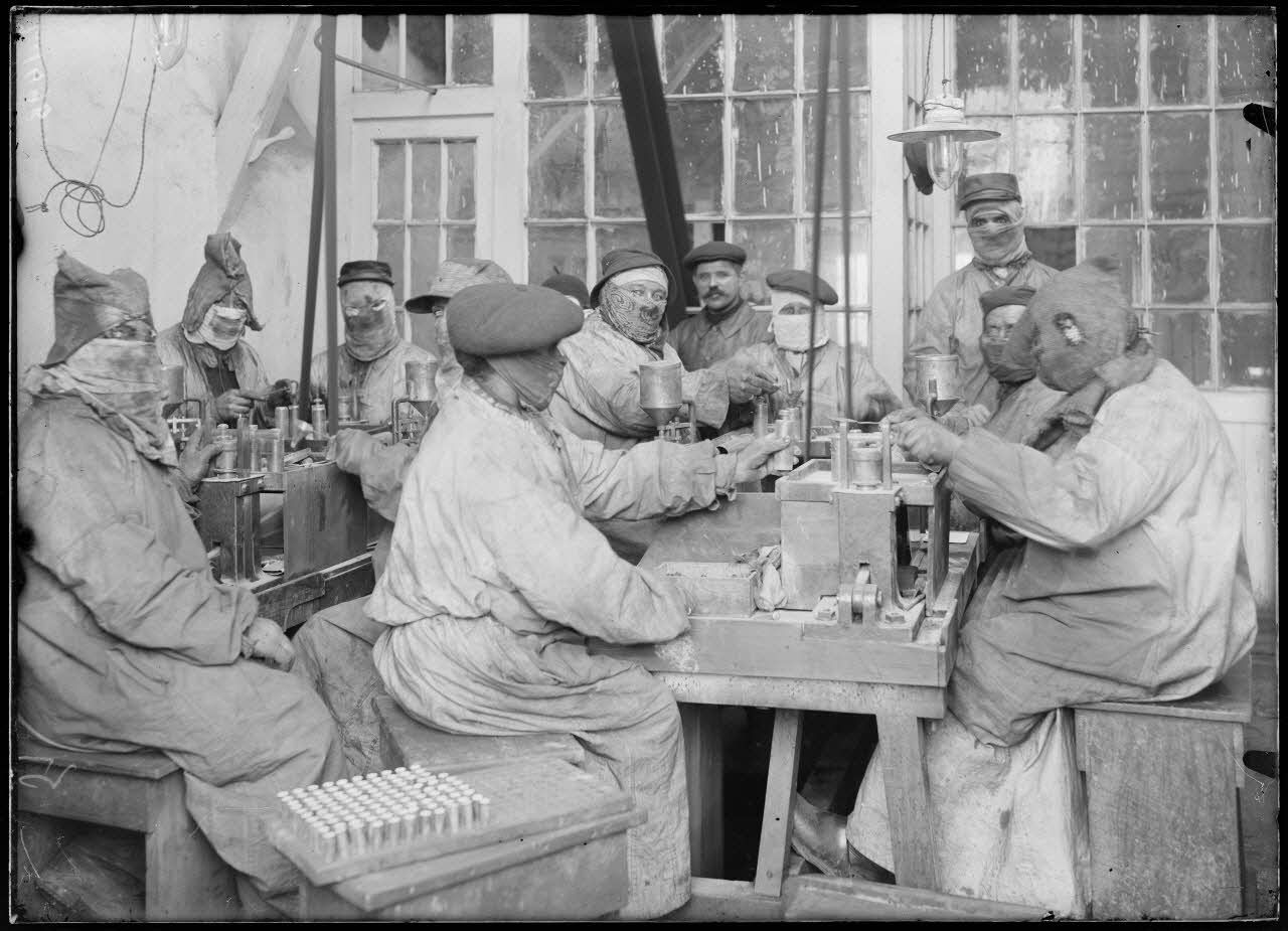 - Aux forges de la Chaliassière, (Saint-Etienne, janvier 1916, Z 1375 à Z 1388) les ouvriers et ouvrières préparent des bombes à ailettes (torpilles pour les mortiers de tranchées) ; des femmes équipées de lunettes de soudeur font de la soudure au chalumeau sur les ailettes des bombes.