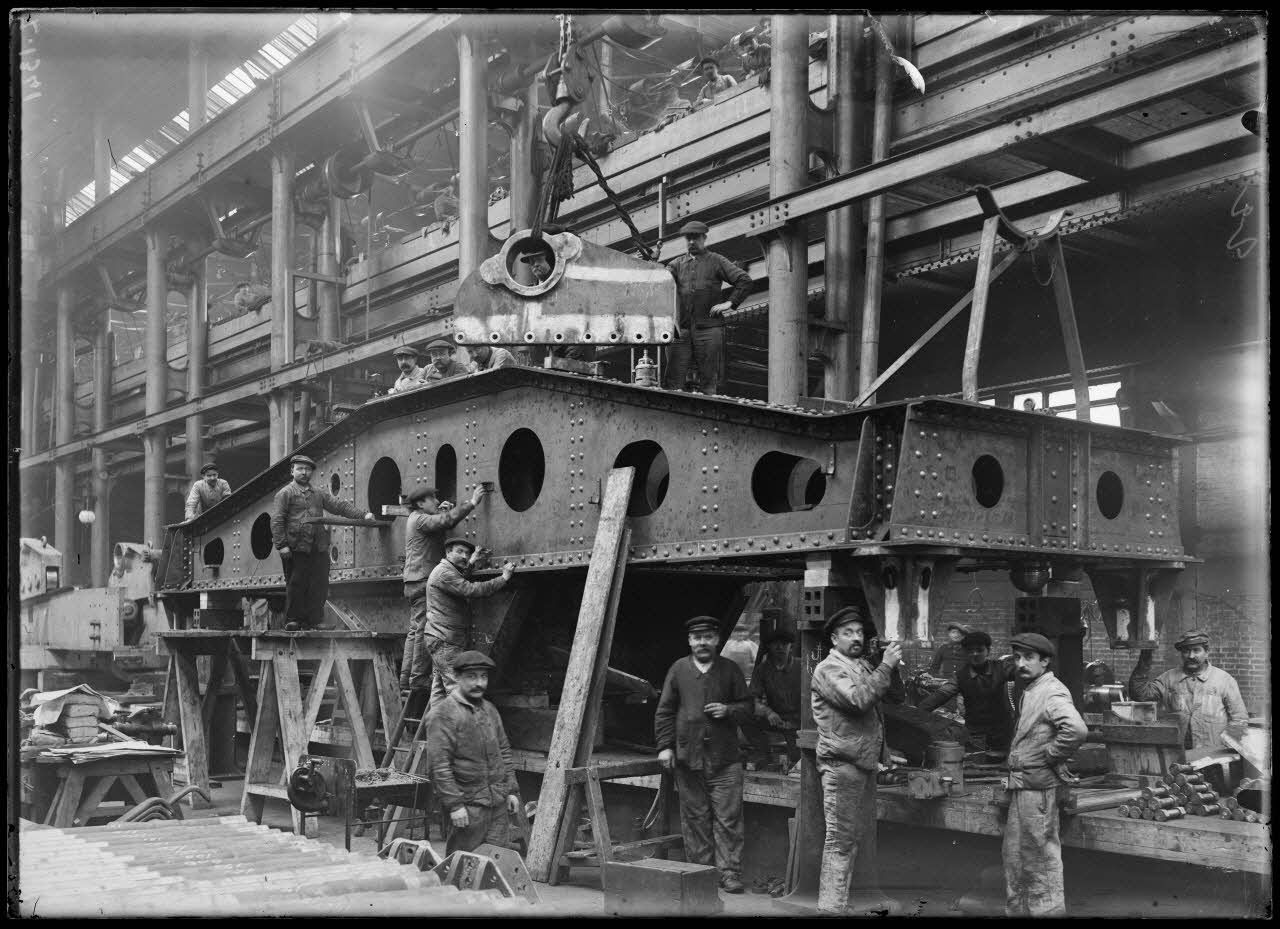 Aciéries de Saint-Chamond. Construction d'un pont en tôlerie pour canon de 340 mm. [légende d'origine]