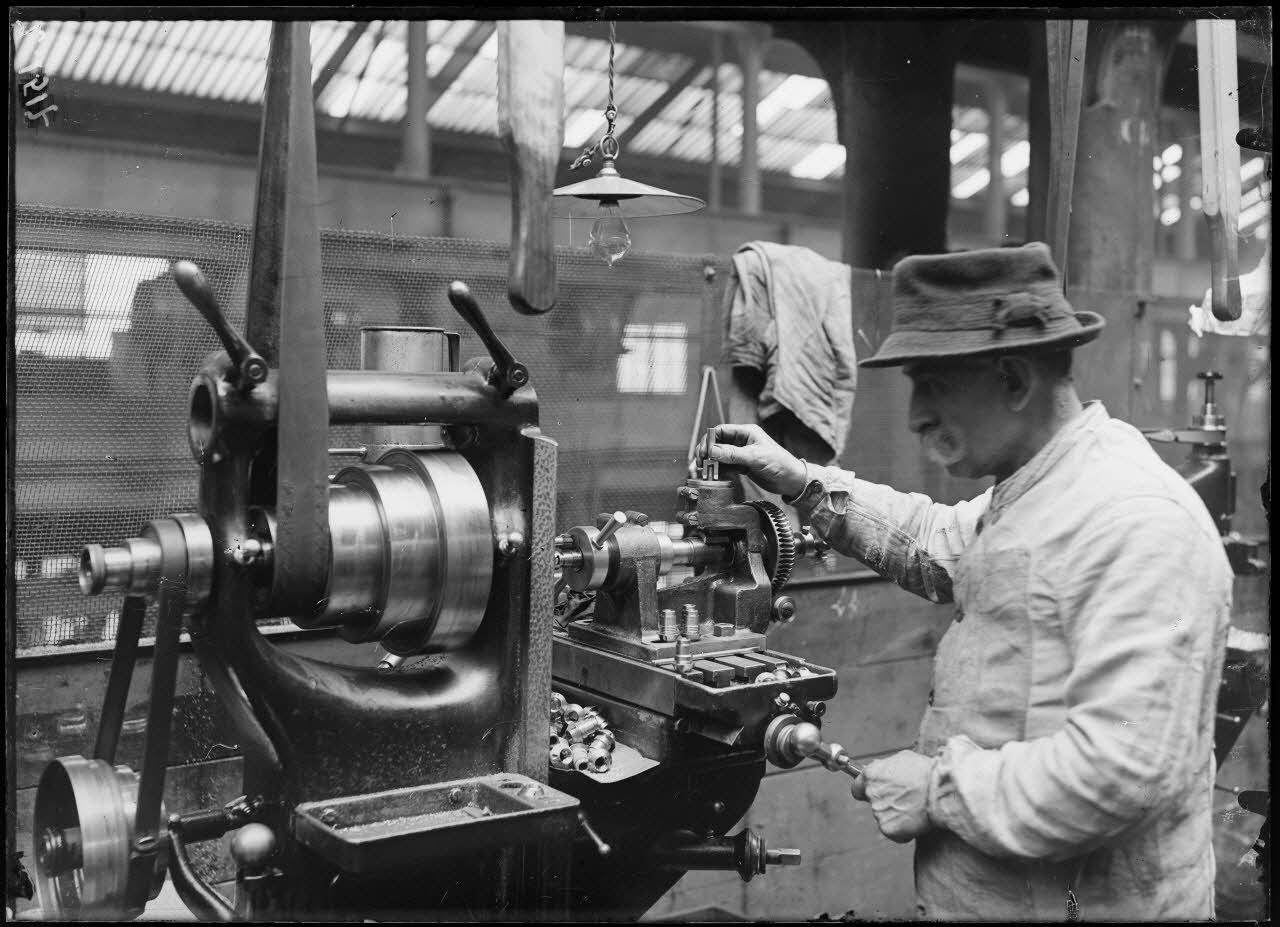 Forges de la Chaléassière (Saint-Etienne). Fabrique de bombes de 58 mm. Finissage de la calotte.
