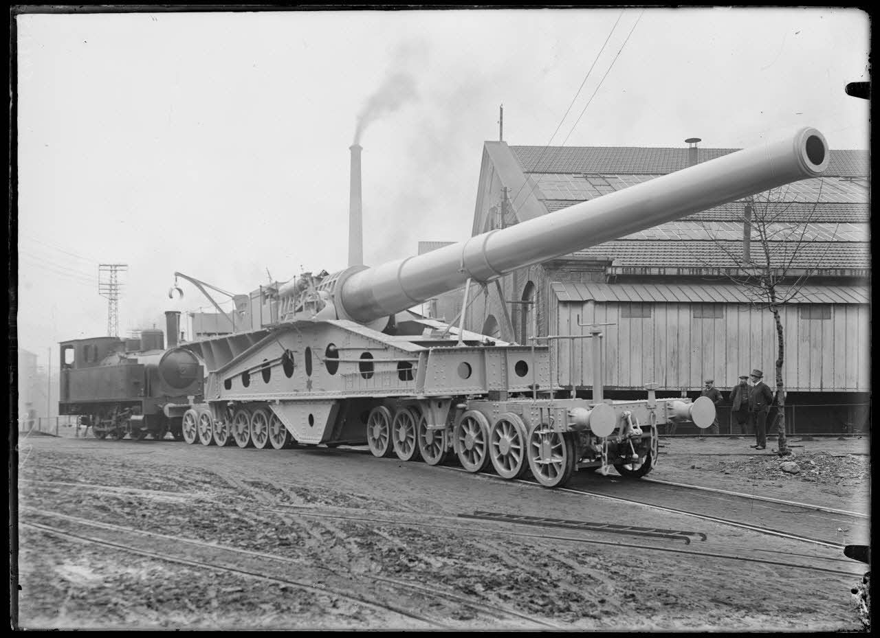 Aciéries de Saint-Chamond. Matériel d'artillerie lourde à grande puissance. Canon de 340 mm monté sur truck. Poids 164 000 kg - portée 35 kilomètres - longueur 17 m ; poids du projectile 550 kilogrammes.