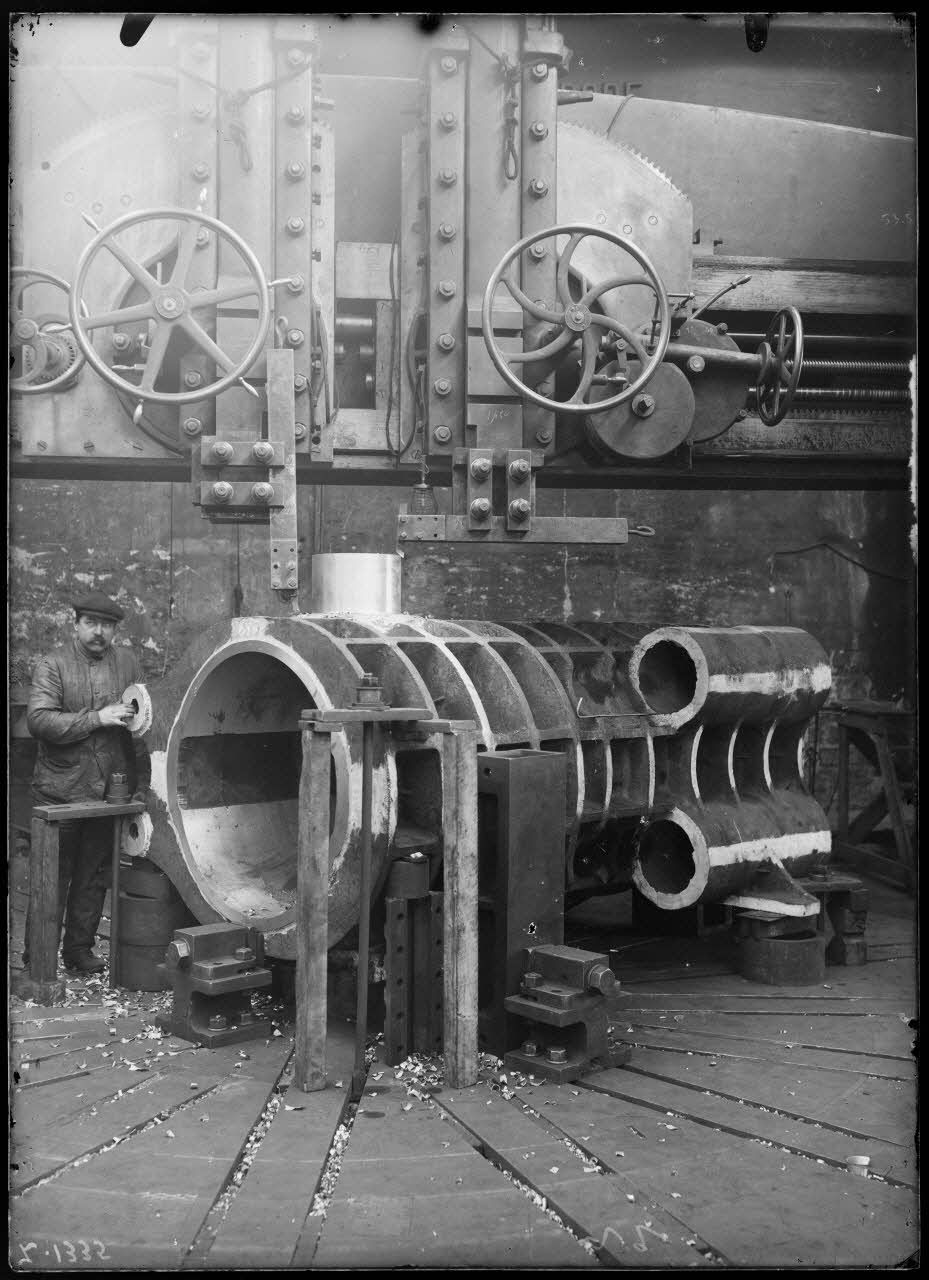 Saint-Chamond. Atelier de finissage des canons de gros calibre. Vue prise d'un canon de 340 mm en finition.