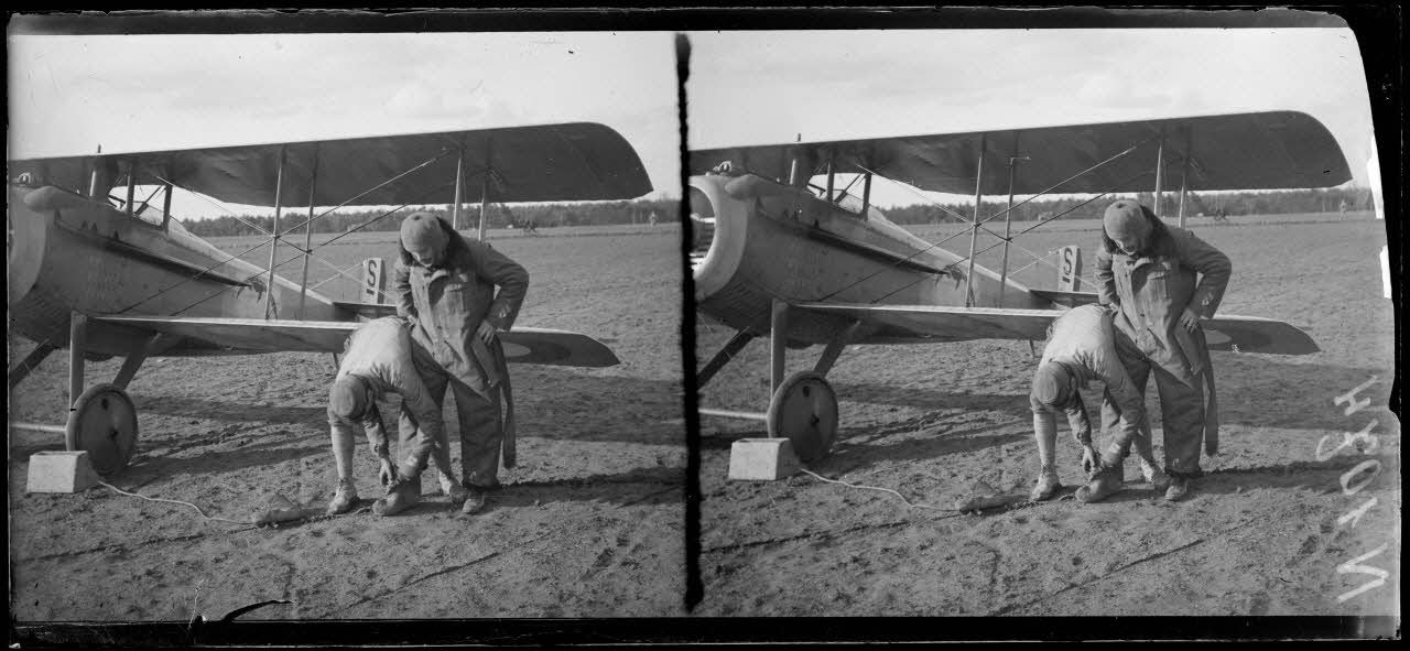 La Noblette près la Cheppe (Marne). Camp d'aviation. Avion de chasse réglant sa mitrailleuse (4-17).