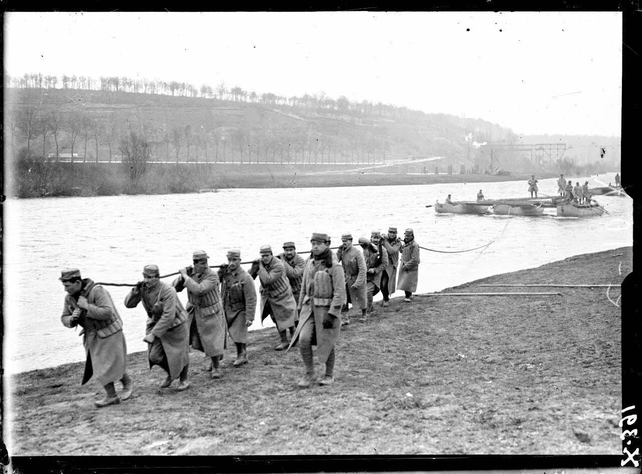 Aingeray (Meurthe-et-Moselle). Près de Toul. Construction d'un pont avec le matériel pris aux Allemands à Blainville-sur-l'Eau (près de Luneville). Mise à l'eau des bâteaux.