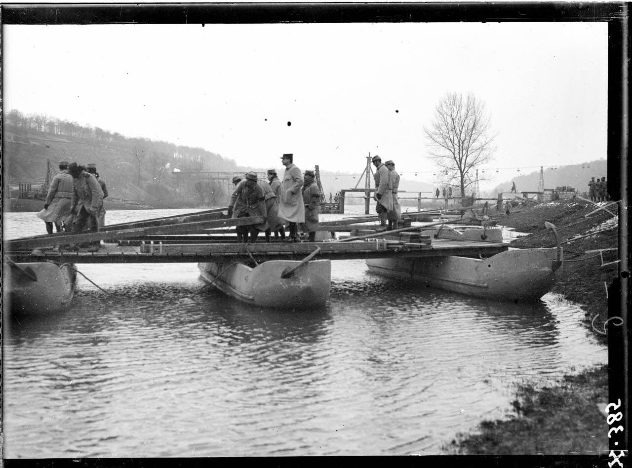 Aingeray (Meurthe-et-Moselle). Près de Toul. Construction d'un pont avec le matériel pris aux Allemands à Blainville-sur-l'Eau (près de Luneville). Mise à l'eau des bâteaux.
