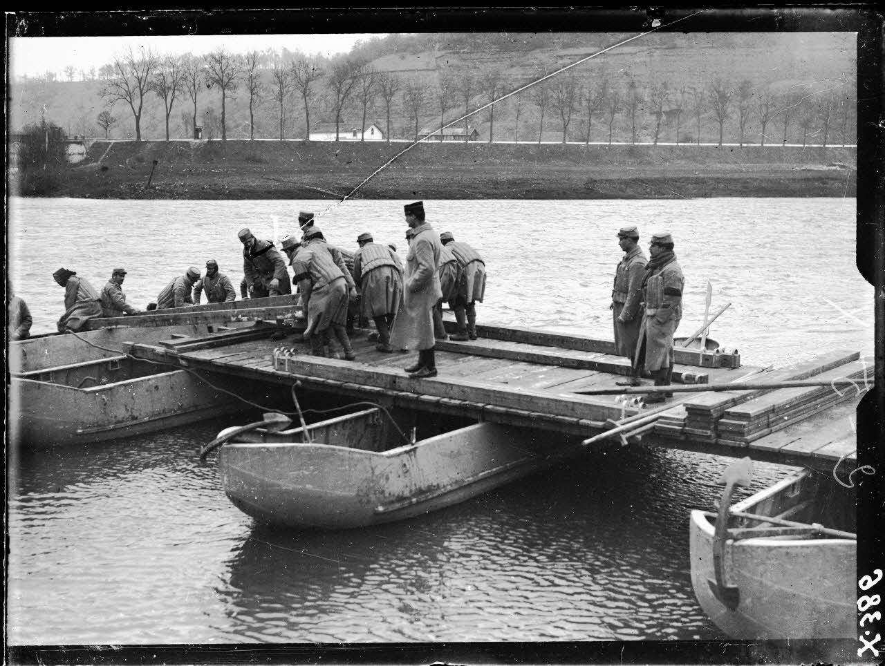 Aingeray (Meurthe-et-Moselle). Près de Toul. Construction d'un pont avec le matériel pris aux Allemands à Blainville-sur-l'Eau (près de Luneville). Mise à l'eau des bâteaux.