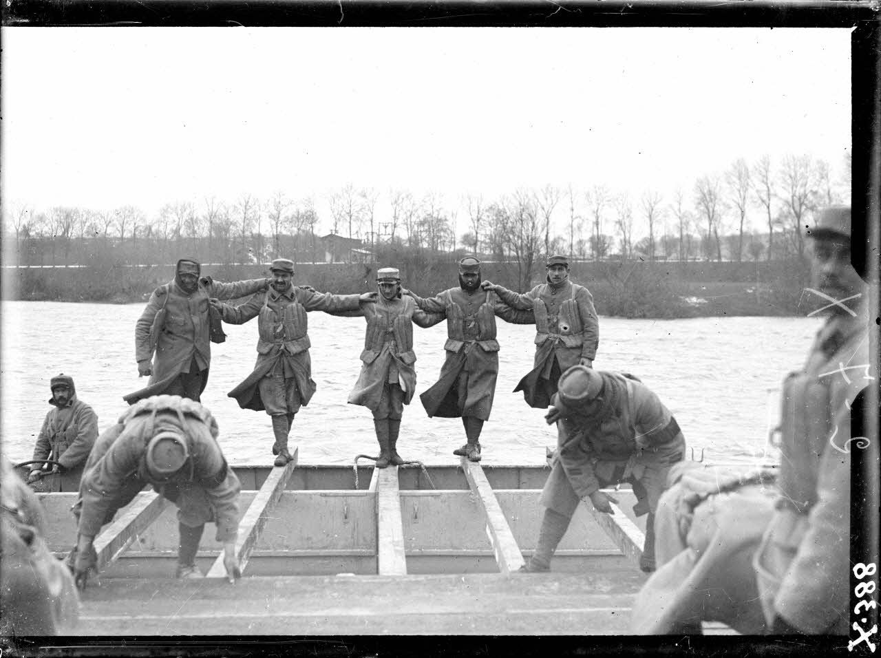 Aingeray (Meurthe-et-Moselle). Près de Toul. Construction d'un pont avec le matériel pris aux Allemands à Blainville-sur-l'Eau (près de Luneville). Mise à l'eau des bâteaux.