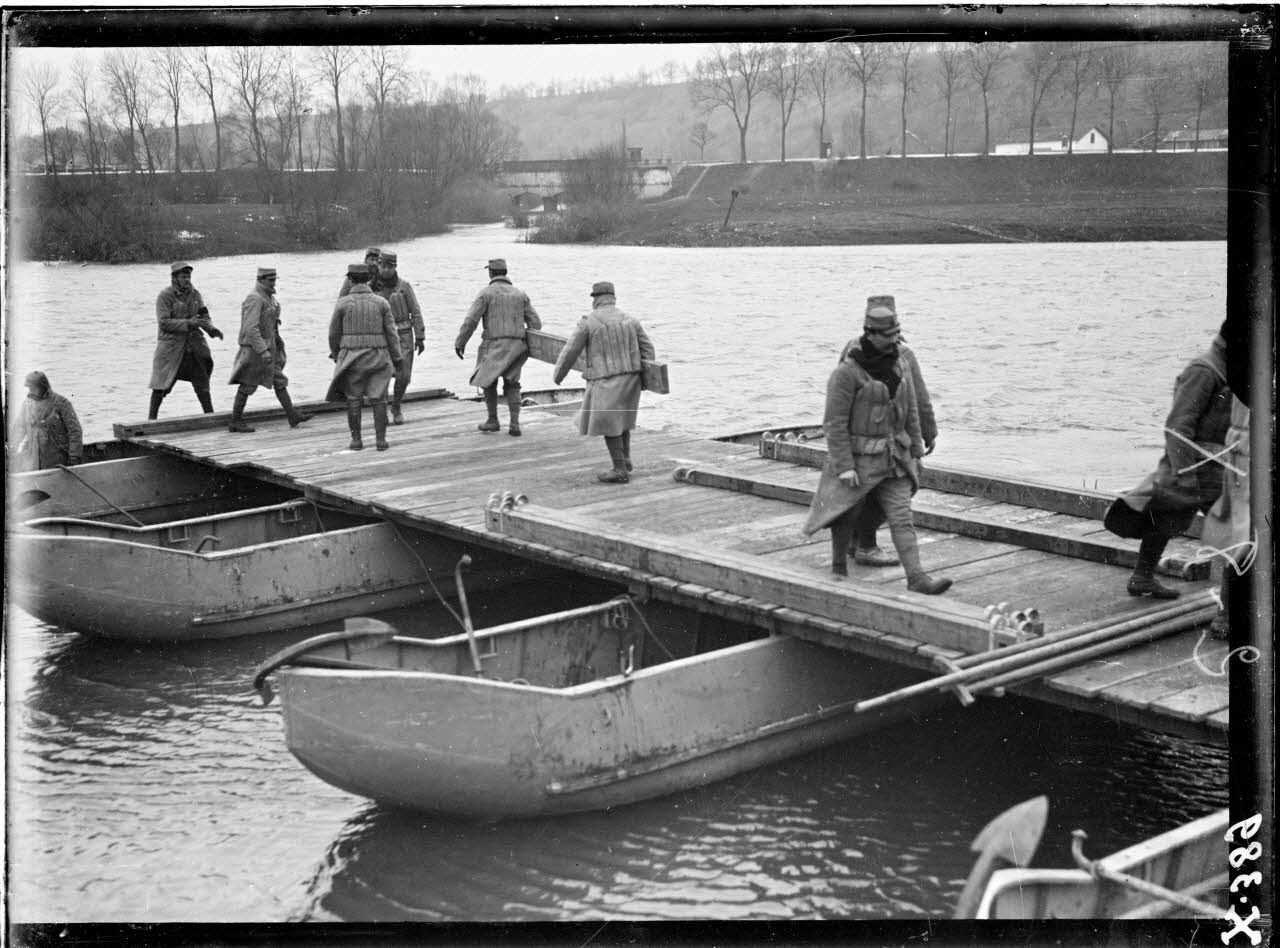 Aingeray (Meurthe-et-Moselle). Près de Toul. Construction d'un pont avec le matériel pris aux Allemands à Blainville-sur-l'Eau (près de Luneville). Mise à l'eau des bâteaux.