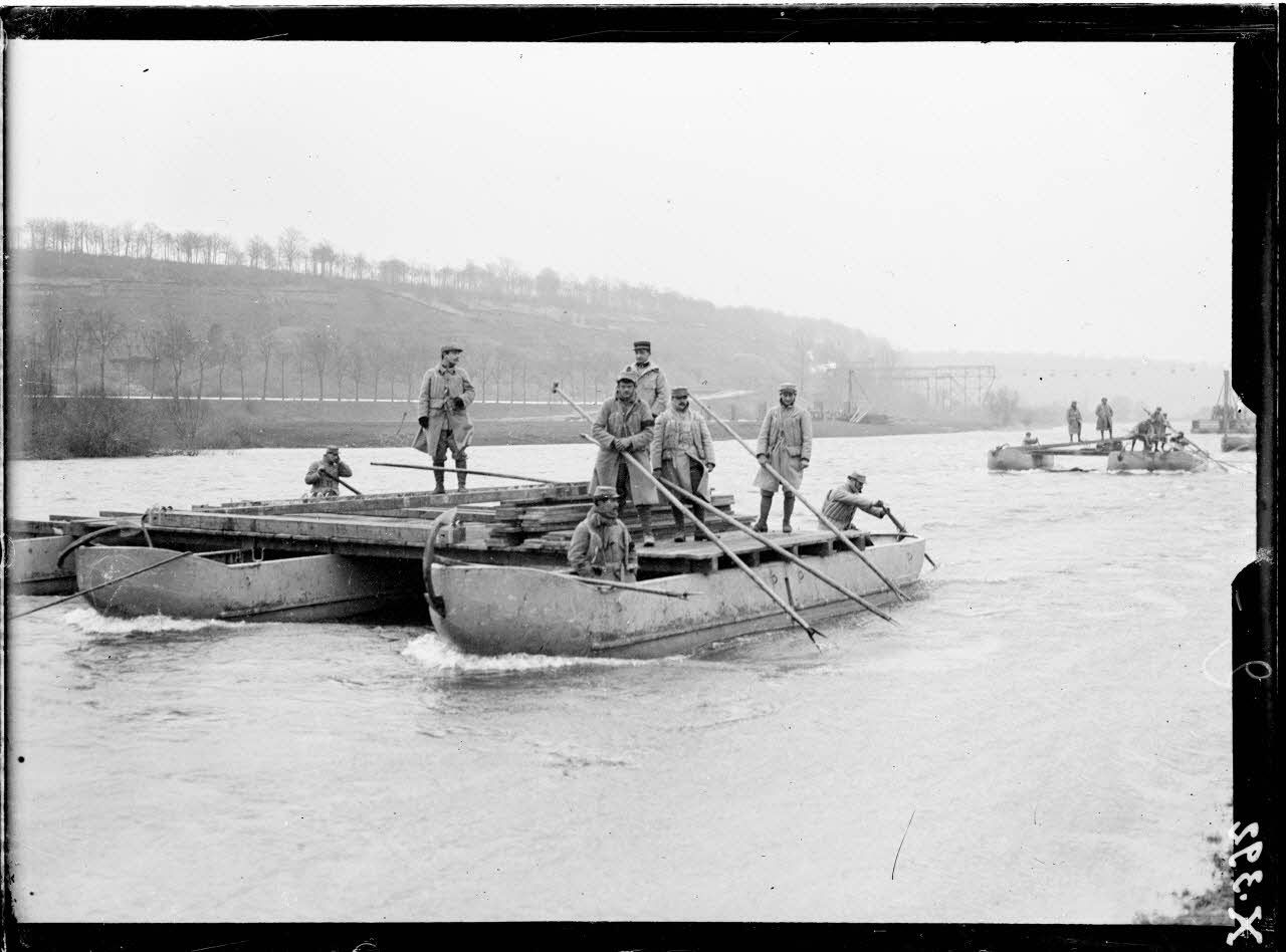 Aingeray (Meurthe-et-Moselle). Près de Toul. Construction d'un pont avec le matériel pris aux Allemands à Blainville-sur-l'Eau (près de Luneville). Mise à l'eau des bâteaux.