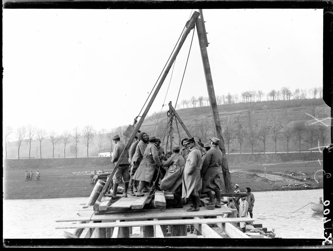 Aingeray (Meurthe-et-Moselle). Près de Toul. Construction d'un pont avec le matériel pris aux Allemands à Blainville-sur-l'Eau (près de Luneville). Mise à l'eau des bâteaux.