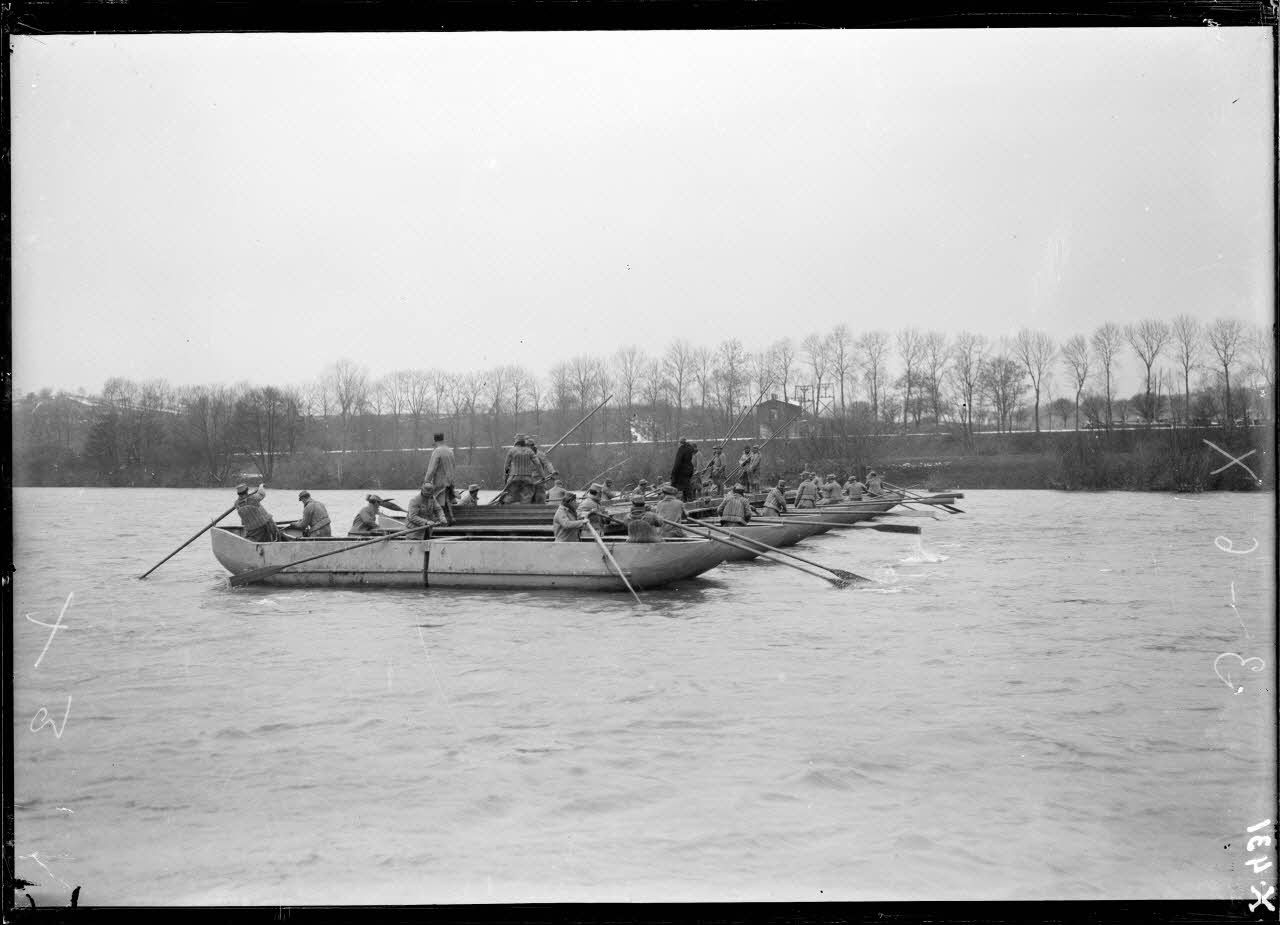 Aingeray (Meurthe-et-Moselle). Près de Toul. Construction d'un pont avec le matériel pris aux Allemands à Blainville-sur-l'Eau (près de Luneville). Mise à l'eau des bâteaux.