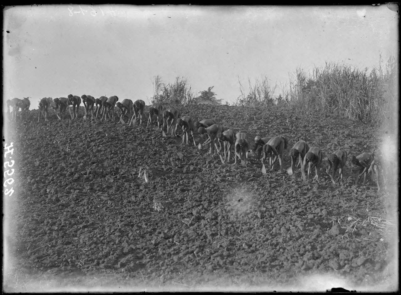 A Akonolinga, des ouvriers agricoles indigènes avancent en rang dans un champ en enfouissant des graines d'arachides dans le sol.