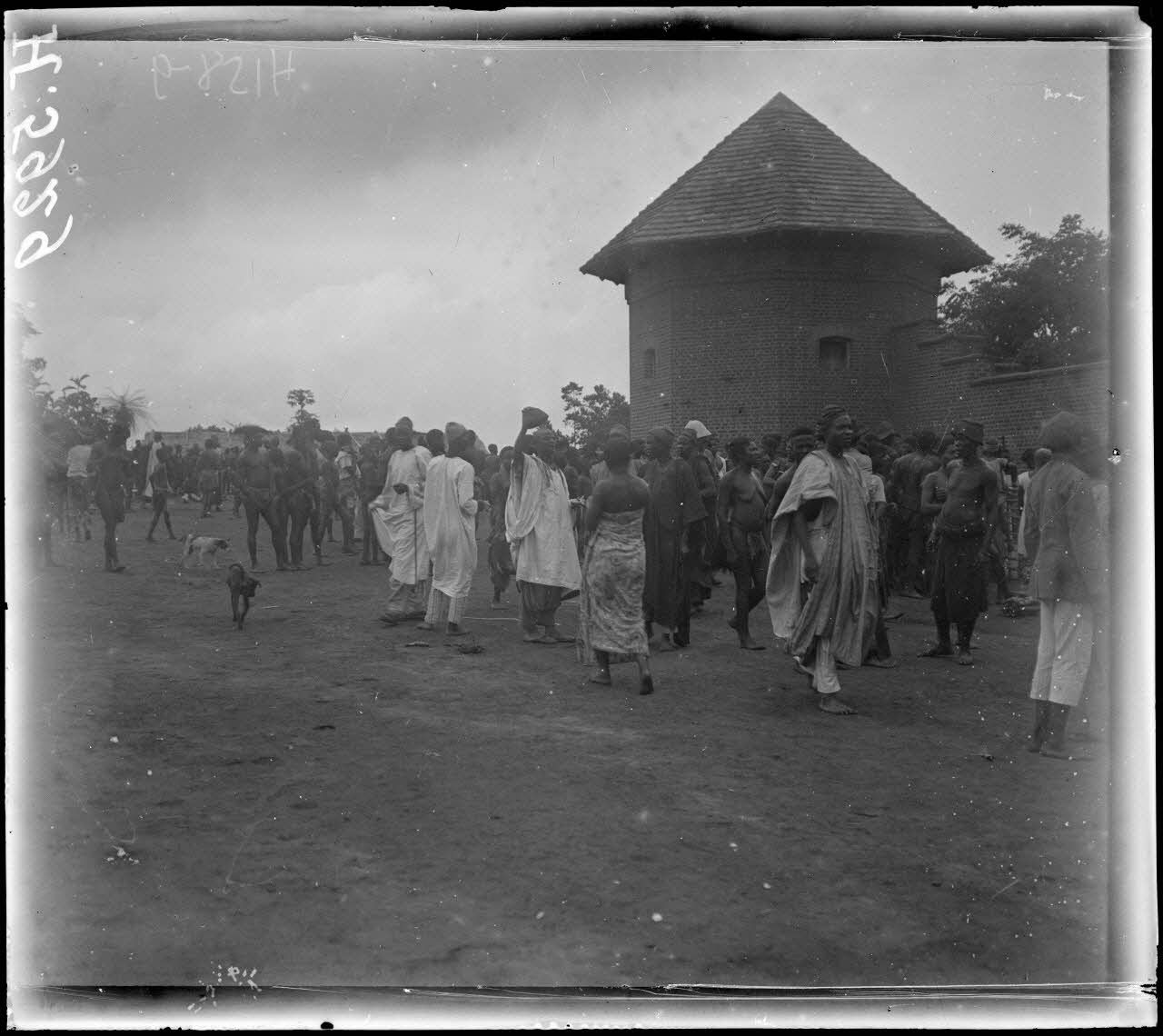 Au marché d' Akonolinga, des officiers effectuent des achats de manioc pour les tirailleurs du poste militaire. Une distribution de nourriture est organisée pour la population indigène et une soupe est préparée pour les prisonniers (cliché manquant).