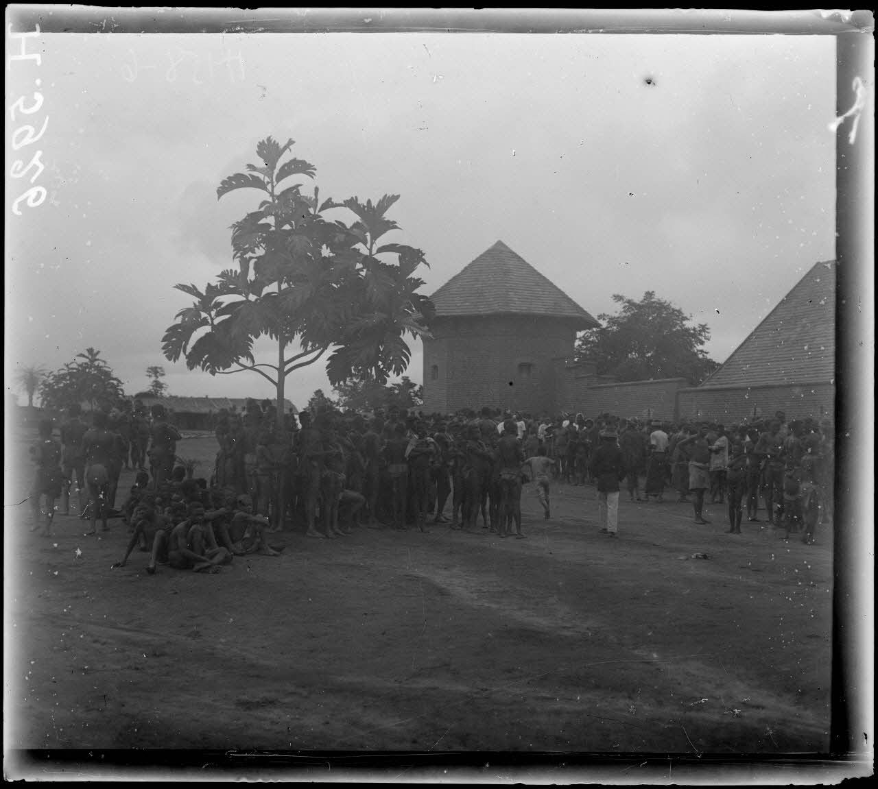 Au marché d' Akonolinga, des officiers effectuent des achats de manioc pour les tirailleurs du poste militaire. Une distribution de nourriture est organisée pour la population indigène et une soupe est préparée pour les prisonniers (cliché manquant).