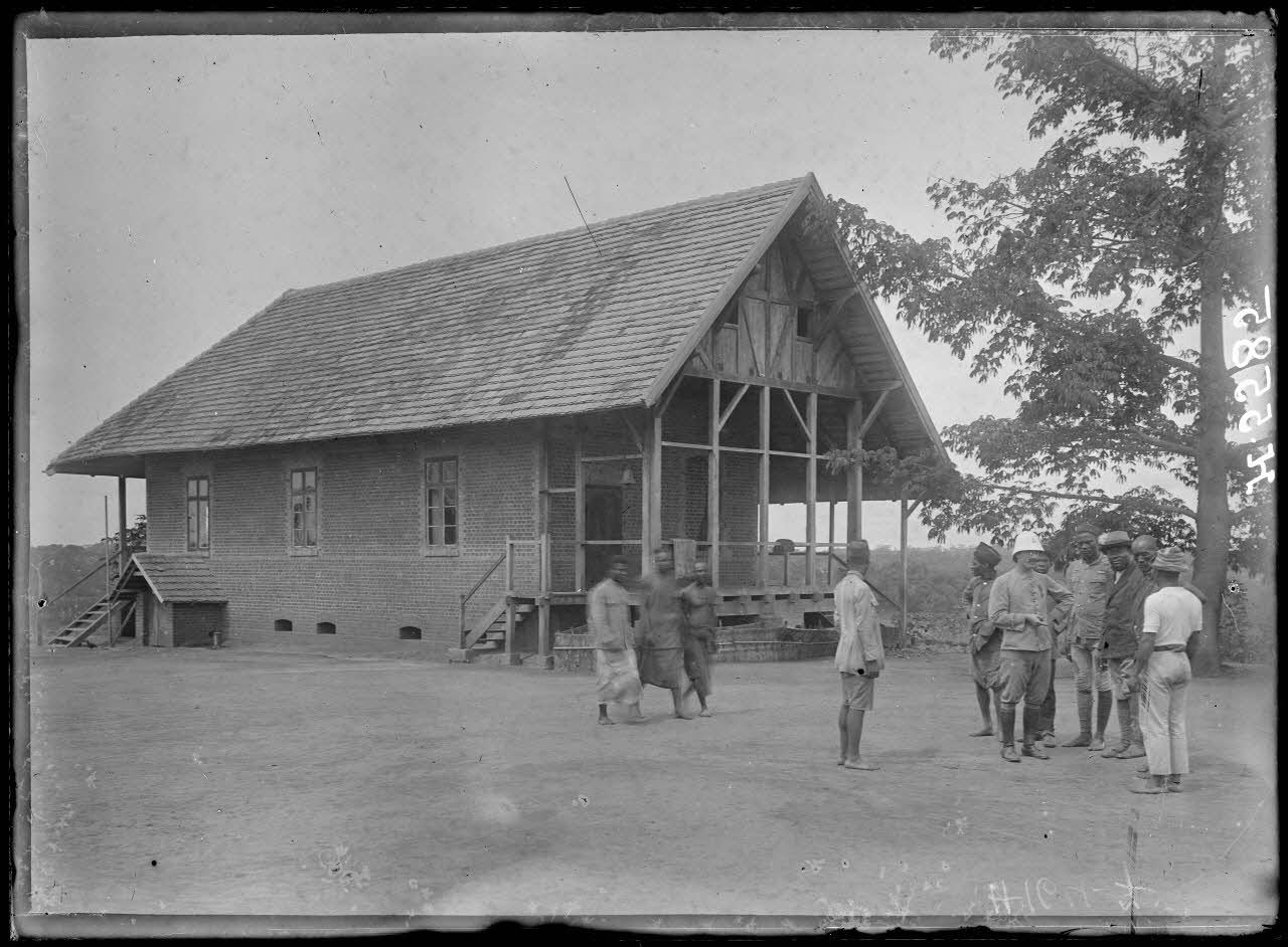 Des tirailleurs et un officier se tiennent devant une villa avec véranda, à Akonolinga.