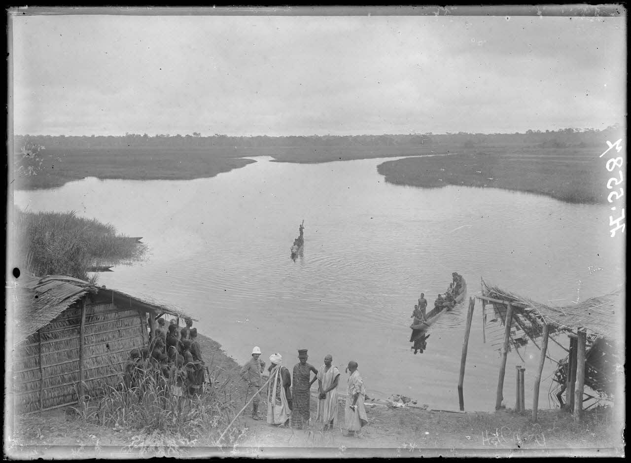 Deux pirogues arrivent sur le Nyong, apportant des produits alimentaires à vendre au marché d'Akonolinga. Des tirailleurs et un officier les attendent sur la rive.