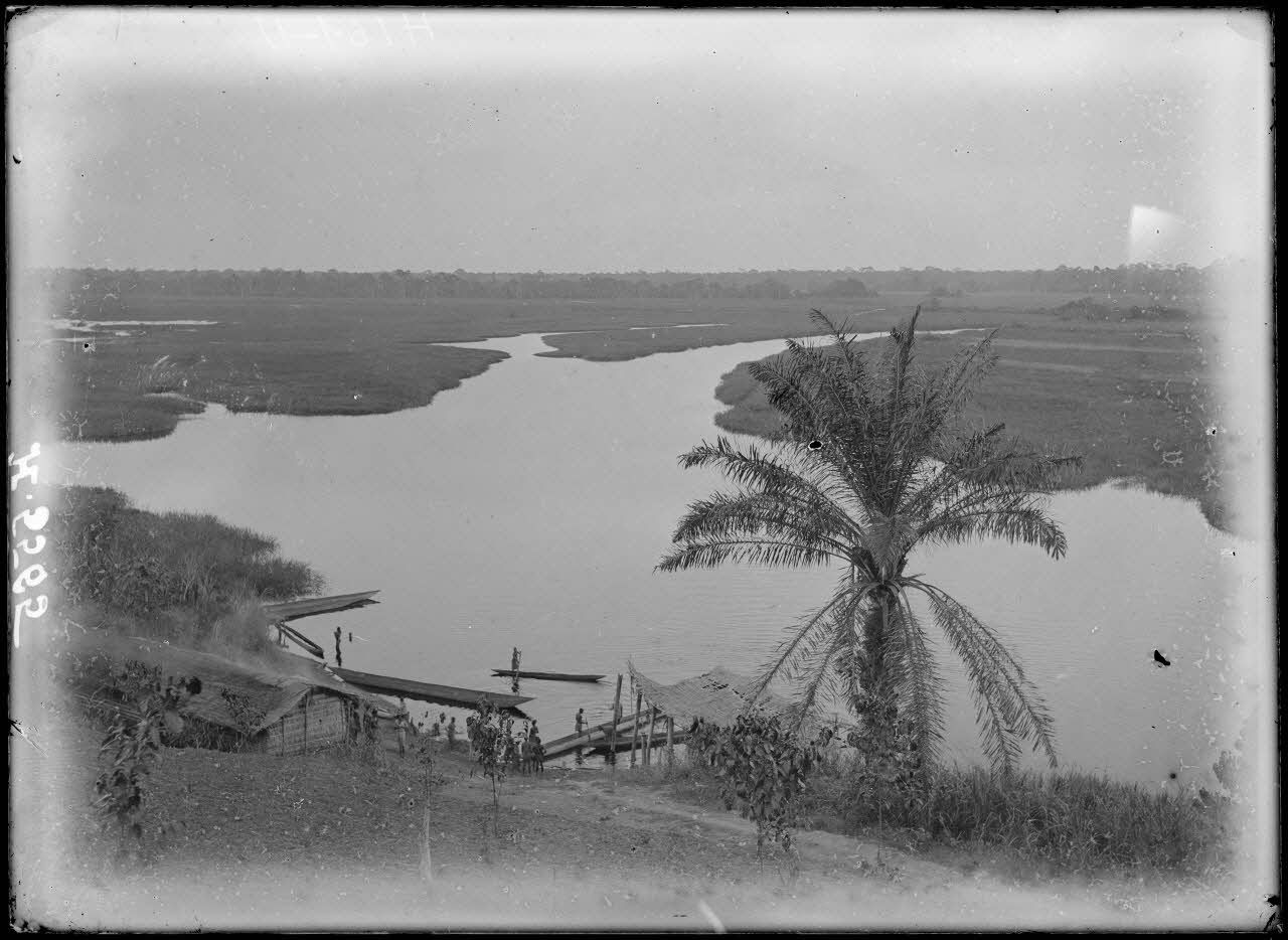 Au pied du village s'étend la vaste plaine du Nyong où le fleuve déroule ses méandres et ses bras nombreux. Des pirogues accostent sur la rive.