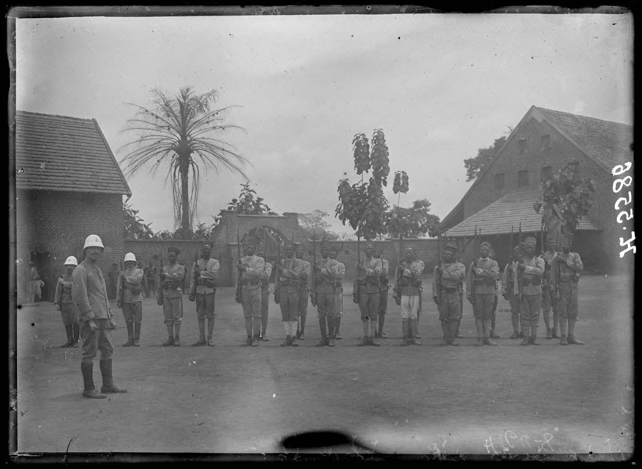 Dans la ville de Yaoundé, des tirailleurs s'exercent sur la place d'armes. Le poste, et le bureau d'un sergent major se situent tout près des factoreries.
