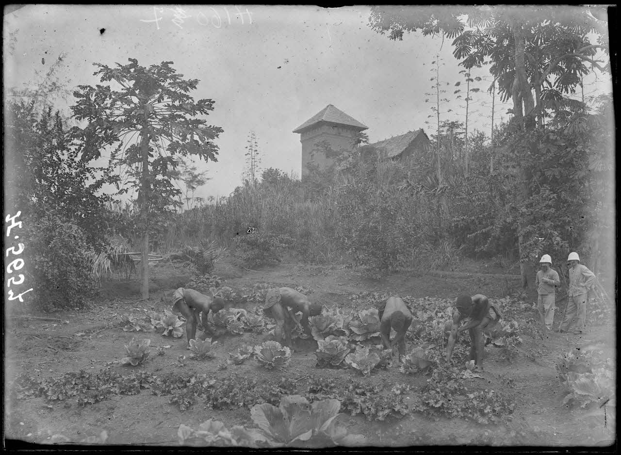 Au jardin potager d'Akonolinga, près de la tour du poste militaire, des ouvriers agricoles cultivent des choux. A gauche du cliché, un papayer et à droite, des agaves en fleurs et un parasolier (Kombo kombo).