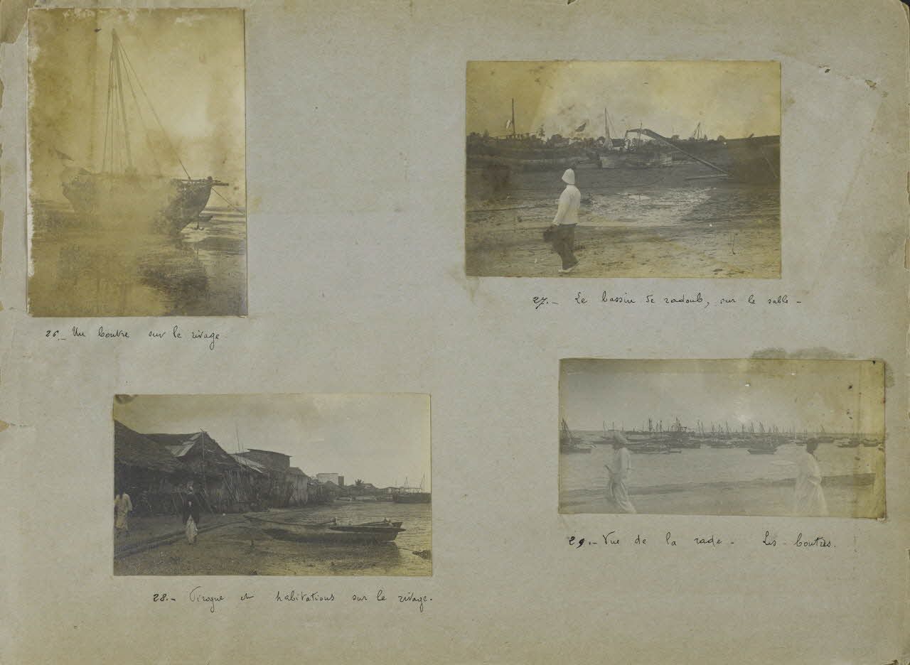 Une boutre sur le canal de Suez, le bassin de radoub, une pirogue et des habitations, une vue de la rade de Suez. Notes : Les légendes ont été rédigées à partir des éléments textuels d’origine présents dans les albums. Les photographies rassemblées et décrites dans ce reportage sont issues d’un album de photographies intitulé « Madagascar 1 » de format 24x18 cm dont les reproductions des pages sont disponibles dans ce reportage.