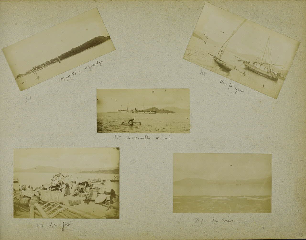 Arrivée à Dzaoudzi à Mayotte, la jetée, la rade, une pirogue, le paquebot l'Iraouaddy au loin. Notes : Les légendes ont été rédigées à partir des éléments textuels d’origine présents dans les albums. Les photographies rassemblées et décrites dans ce reportage sont issues d’un album de photographies intitulé « Madagascar 1 » de format 27x17,5 cm dont les reproductions des pages sont disponibles dans ce reportage.