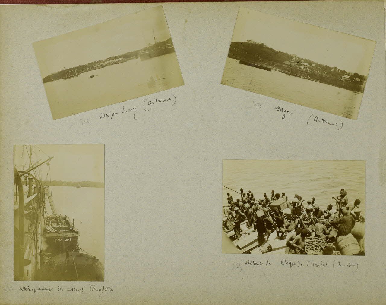 Arrivée à Duego-Suarez (ou Antisiranana), débarquement des casernes démontables, départ de l'équipe de somalis. Notes : Les légendes ont été rédigées à partir des éléments textuels d’origine présents dans les albums. Les photographies rassemblées et décrites dans ce reportage sont issues d’un album de photographies intitulé « Madagascar 1 » de format 27x17,5 cm dont les reproductions des pages sont disponibles dans ce reportage.