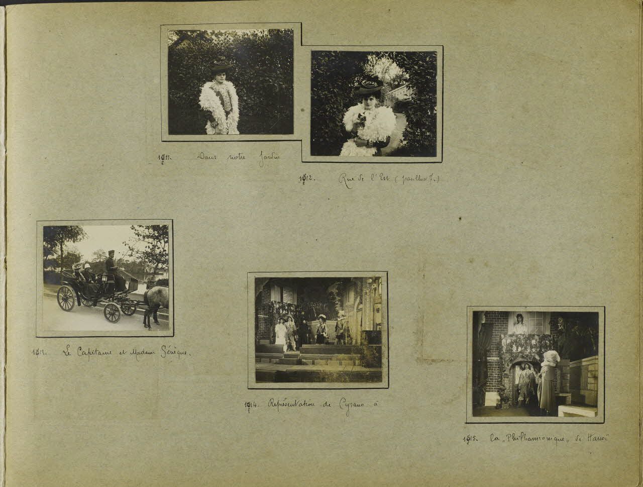 Portraits de Madame Imbert, portrait de comédiens, le capitaine Péri et Madame Sénèque, et photographies d'une représentation de Cyrano de Bergerac à la Philharmonique de Hanoï. Notes : les légendes ont été rédigées à partir des éléments textuels d'origine présents dans les albums. Les photographies rassemblées et décrites dans ce reportage sont issues d’un album de photographies intitulé « Madagascar 1 » de format 31,5x24,1 cm dont les reproductions des pages sont disponibles dans ce reportage.