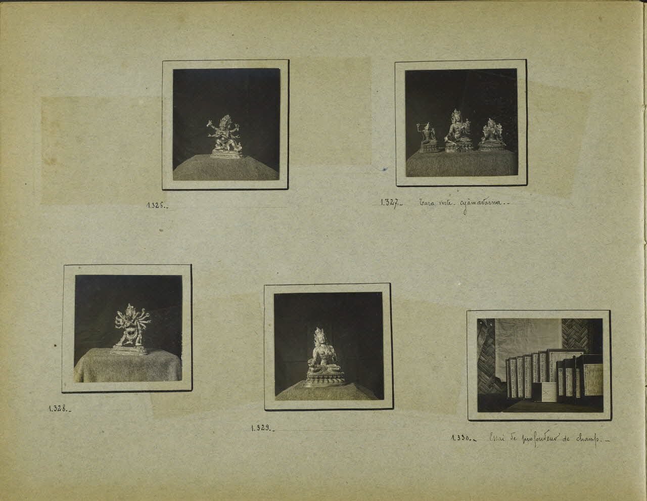 Essai de profondeur de champ et multiples objets d'art de la collection de l'école française d'Extrême-Orient à Hanoï : des statuettes notamment de la Tara verte. Notes : les légendes ont été rédigées à partir des éléments textuels d'origine présents dans les albums. Les photographies rassemblées et décrites dans ce reportage sont issues d’un album de photographies intitulé « Madagascar 1 » de format 31,5x24 cm dont les reproductions des pages sont disponibles dans ce reportage.