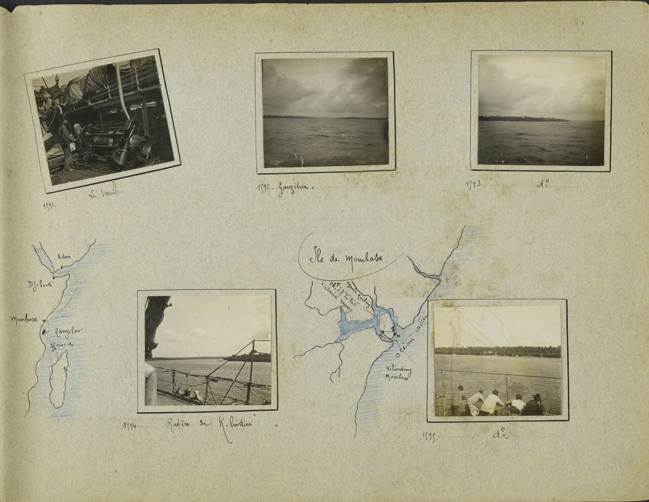 Notes : dessins de la côte est de l'Afrique : carte indiquant Aden, Djibouti, Mombasa, Zanzibar, Comores et Madagascar. Dessin sous forme de carte de l'île de Mombasa. Les photographies rassemblées et décrites dans ce reportage sont issues d’un album de photographies intitulé « Madagascar 1 » de format 31,6x24,1 cm dont les reproductions des pages sont disponibles dans ce reportage.
