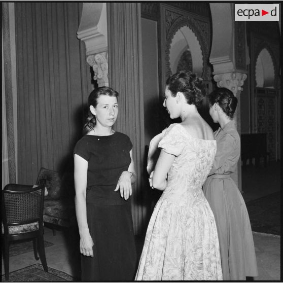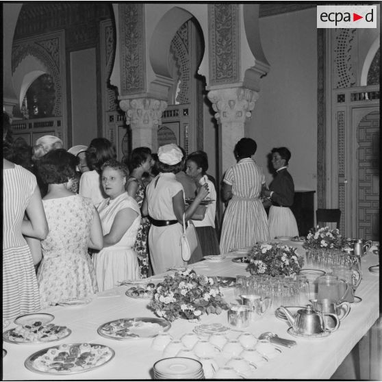 Alger. Cocktail organisé pour des étudiantes d'une section administrative urbaine (SAU) chez Mme Robert Lacoste.