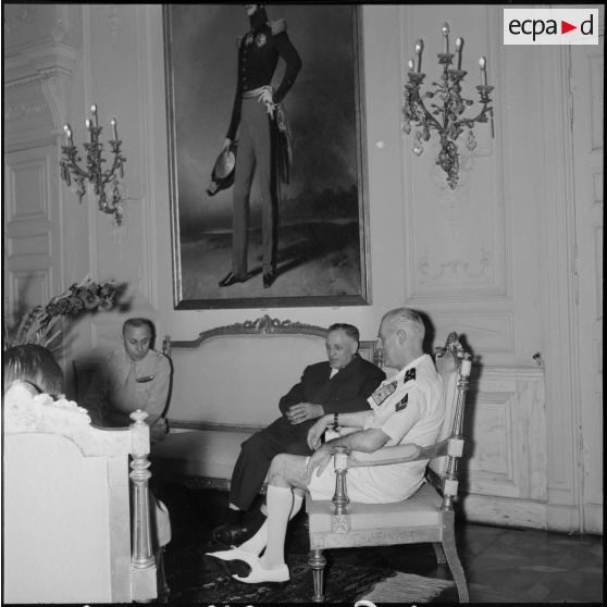 Dans les salons de la Xe RM le général d'armée Raoul Salan s'entretient avec M. Meyer et le colonel D'Aviron directeur du service social de la Xe RM.