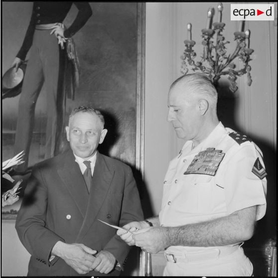 Monsieur Meyer directeur du service cinématographique du gouvernement général de l'Algérie remet un chèque de deux millions au général d'armée Raoul Salan commandant supérieur interarmées et commandant la Xe RM (Xe région militaire), pour les oeuvres sociales de la Xe RM.