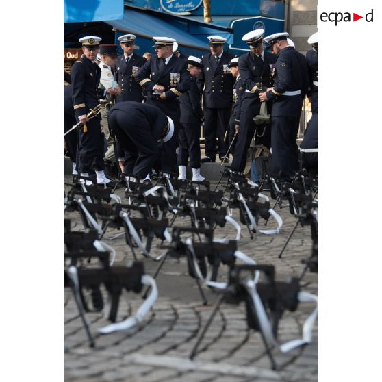 Alignement des fusil d'assaut FAMAS modèle G2 utilisés par les défilants de la Marine nationale en attente de défiler lors du 14 juillet 2018 à Paris.