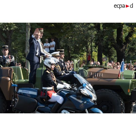 Monsieur Emmanuel Macron, président de la République française, remonte les Champs-Elysées à bord du "command car" lors du défilé militaire du 14 juillet 2018 à Paris.