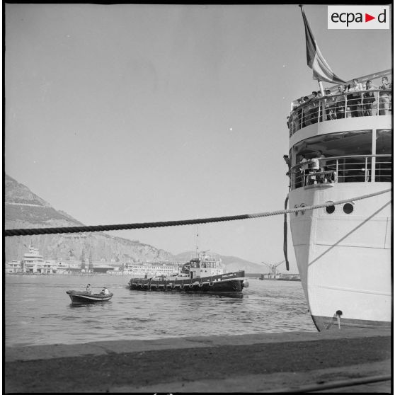 A gauche, le remorqueur Goeland IV s'approche du paquebot.
