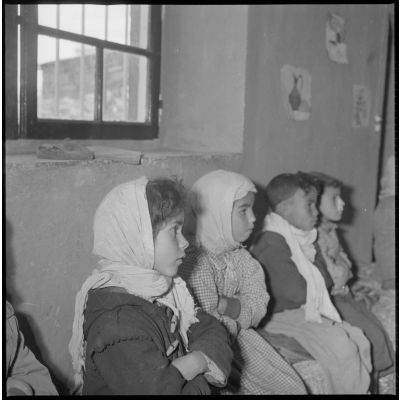 Aménagement de l'eau dans le secteur de Tamesna sous le commandement du capitaine Vinck. Dans une salle de classe, portrait de jeunes enfants assis sur des ballots de foin qui tiennent lieu de bancs d'école.