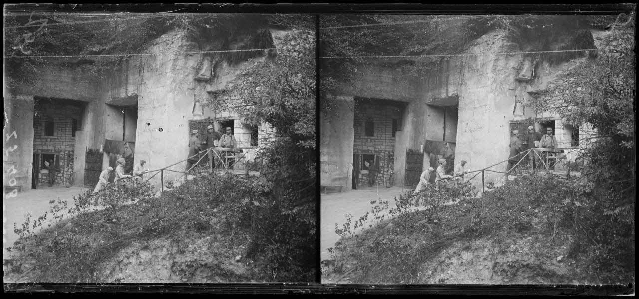 Dans la carrière du Chauffour (sur la commune de Thiescourt, Oise, Z 397 à Z 408), les soldats organisent leur cantonnement dans la carrière (cuisine, chambrée, tailleur et cordonnier, poste de secours, cimetière).