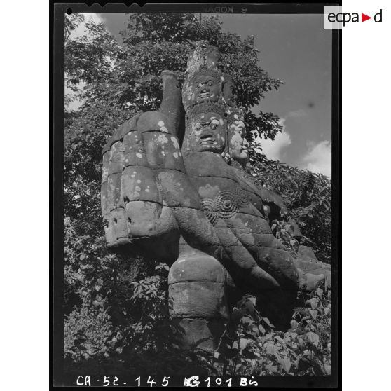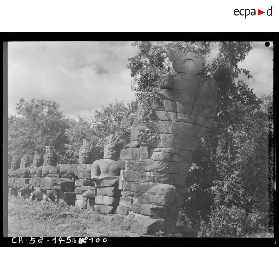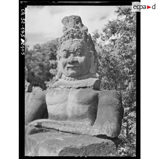 Géant polycéphale et à bras multiples étreignant la queue du Naga, formant balustrade devant la porte dite des Morts de l'enceinte Est du Bayon.