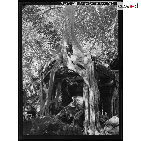 Un temple en ruines surmonté de racines d'arbres, dans la région d'Angkor.