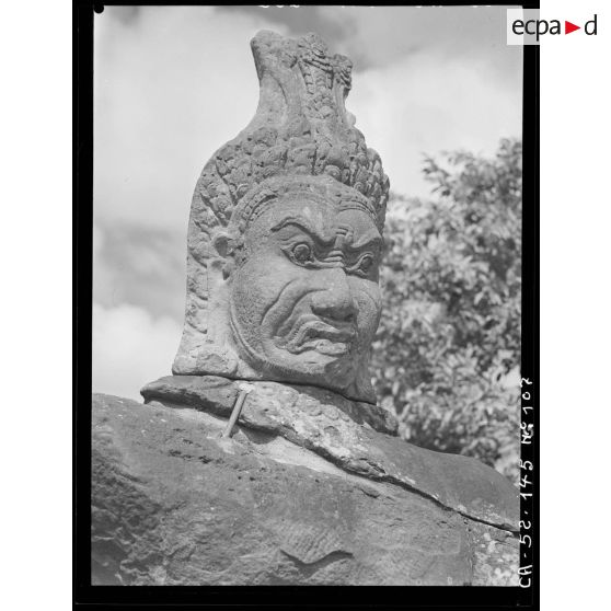 Tête d'Assura (démon) de la balustrade devant la porte de l'enceinte Nord du temple Bayon.