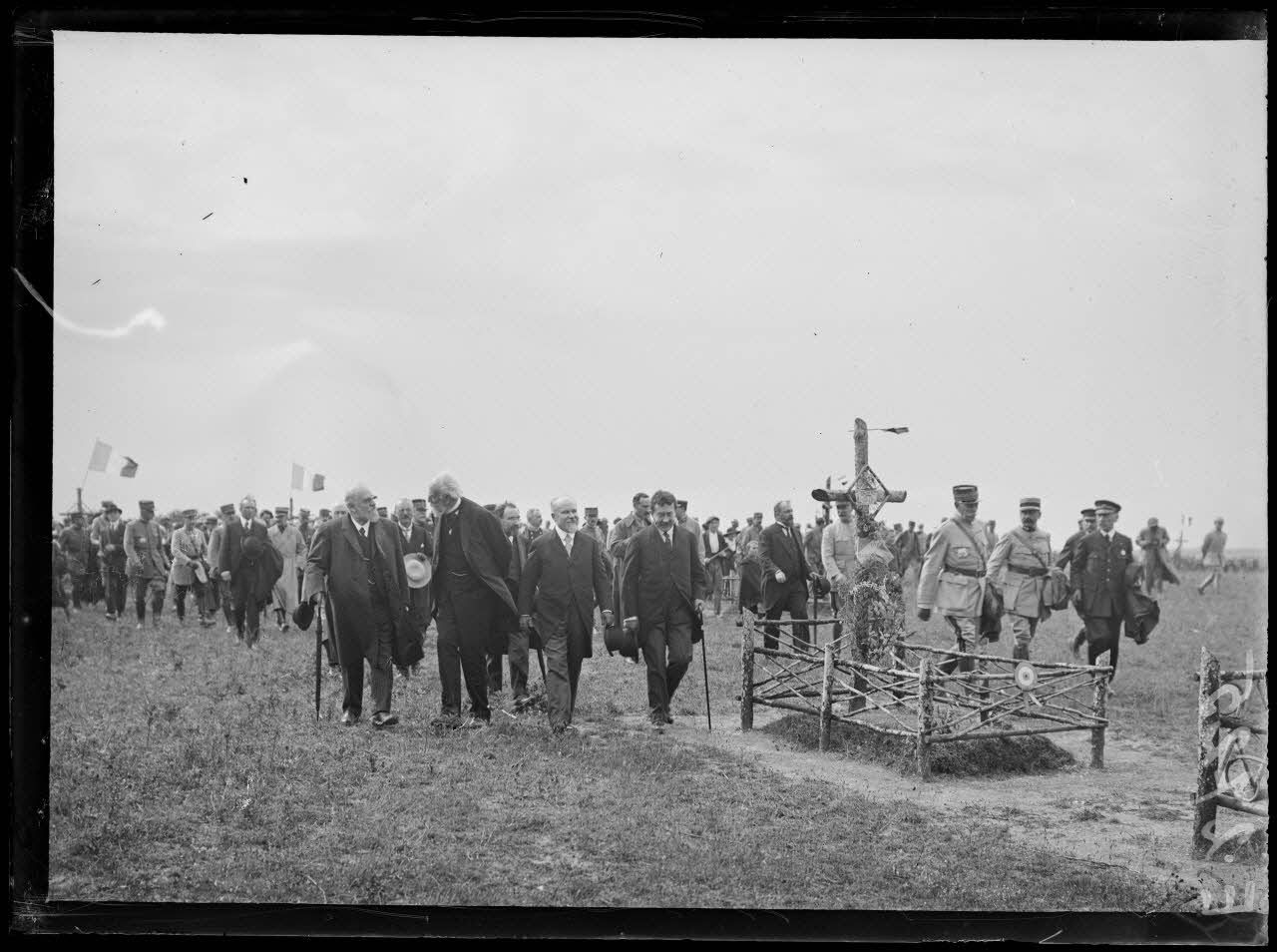 Anniversaire de la Bataille de la Marne. Le cortège officiel sur le terrain, au centre le Maréchal Joffre.