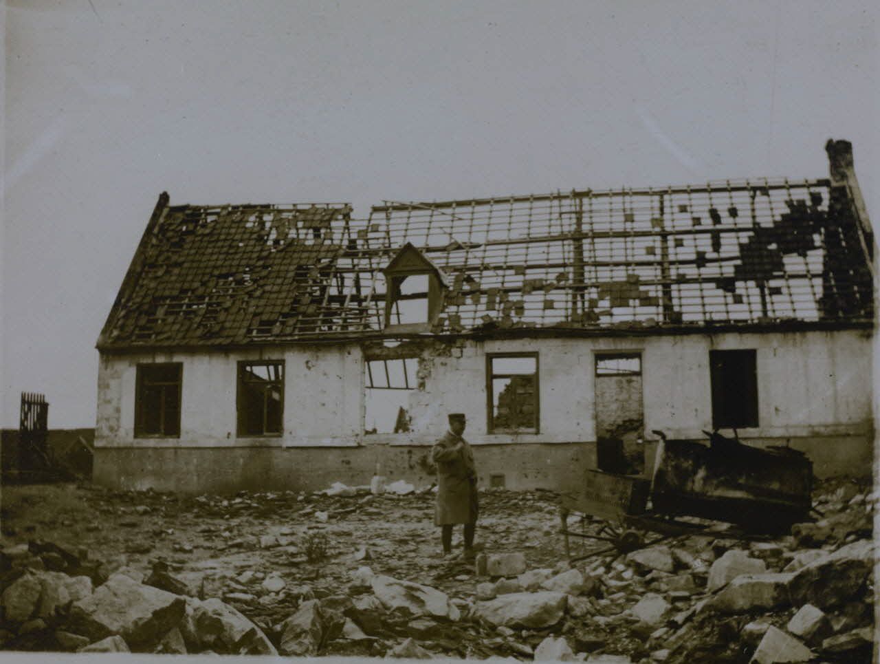 Les archives photographiques du médecin major Augarde, affecté au 138e régiment d''infanterie, sont caractéristiques de la production d''images fixes des militaires pendant la Grande Guerre : portraits de camarades, édifices religieux et terrains dévastés par les bombardements ennemis, etc. Les photographies cotées en D0349-003 étaient conditionnées dans une enveloppe intitulée « L’Artois / Parrajou ».